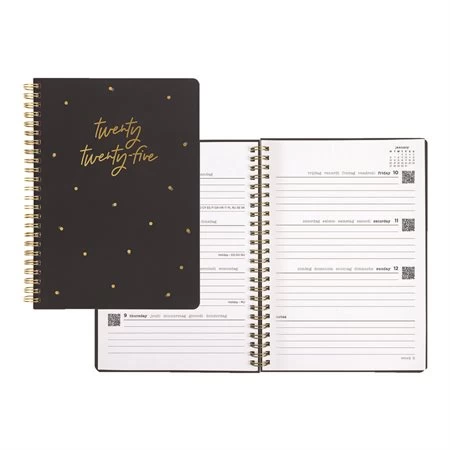 8-1/4 x 5-7/8 po. Sans horaire de rendez-vous. Espace ligné pour chaque jour de la semaine. Reliure spirale double dorée et couverture laminée mate rigide avec détails dorés. Pochette de rangement. Multilingue.