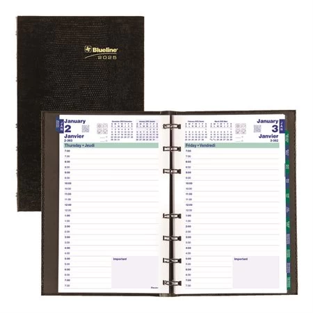 8 x 5 po. Un jour par page. Couverture rigide d’aspect lézard et reliure spirale double CoilPro™. 7h00 à 19h30. Rendez-vous aux 30 minutes. Inclut 10 pages lignées MiracleBind™ qui s’enlèvent et se replacent. Onglets laminés et autocollants. Pochette de rangement. Contenu recyclé : 50 %, postconsommation : 50 %. Certifié FSC® C135627.