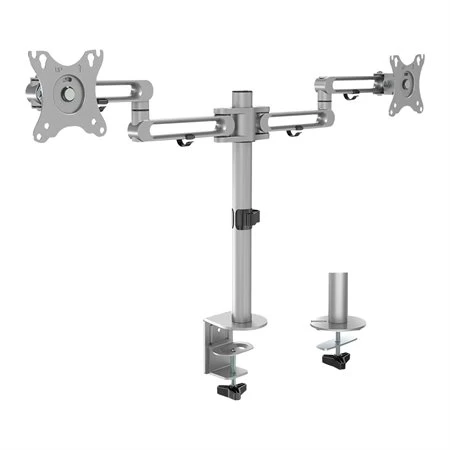 Construction légère en aluminium. Trous pré-fait pour une installation facile de la plaque VESA. Hauteur du poteau de 15,7 po avec une portée de 17,75 po. Capacité de 17,6 lb (par bras). Convient à la plupart des moniteurs de 17 à 32 pouces. Inclinaison +30° à -30°, pivotement +90° à -90°, rotation +180° à -180°. Plaque de montage VESA pour 75 mm et 100 mm. Fixation par pince ou œillet (tous deux inclus). Clips de gestion des câbles intégrés. Gris métallique. Vendu à l’unité.