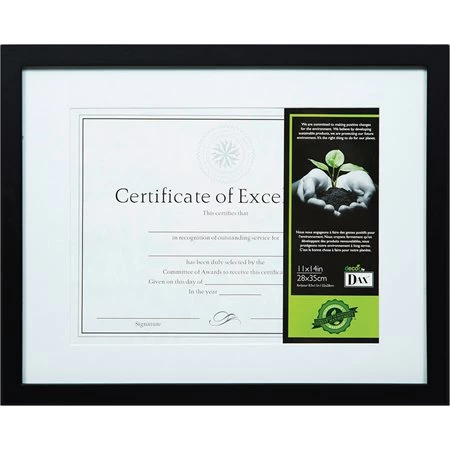 Cadre mural et de bureau 100% bois FSC. Cintres pour affichage mural. Comprend une façade en verre de protection, une fermeture à bouton-poussoir et un certificat prêt à l’emploi. Cadre noir avec finition satinée. Tapis biseauté blanc cassé. Taille du cadre : 11 x 14 po. Taille de l’insertion : 8,5 x 11 po. Bois provenant de forêt bien gérée