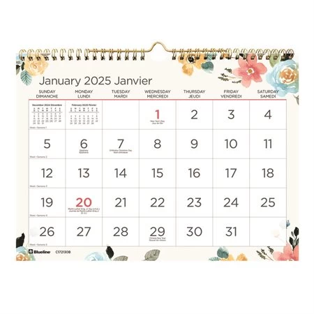 11 x 8 po. 12 mois. Gros caractères et couleurs contrastantes plus facile à lire. Un mois par feuille, un bloc par jour. Calendriers des mois passés et suivants sur chaque feuille. Support de carton renforcé. Reliure spirale double avec œillet pour suspendre. Bilingue.