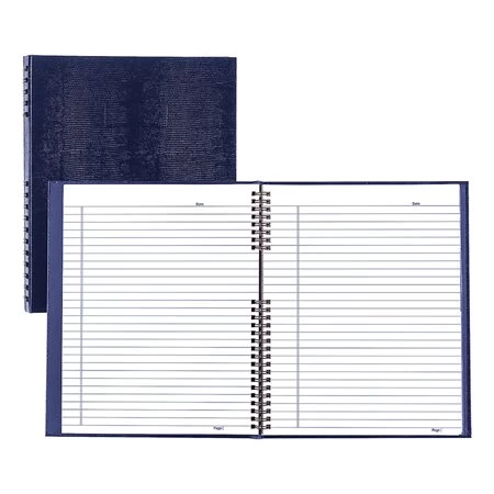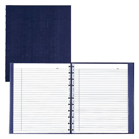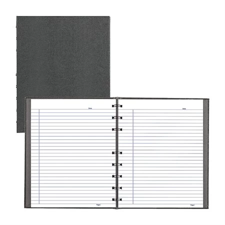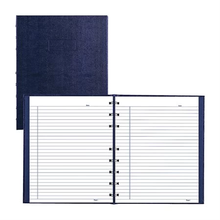 Reliure double spirale avec couverture rigide façon lĂ©zard. Pages lignĂ©es micro-perforĂ©es avec marge. Papier recyclĂ© blanc. Feuille d’index, onglets autocollants et pochette de rangement. Postconsommation : 50 %. FabriquĂ© au Canada.