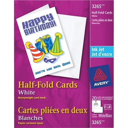 Pour imprimantes à jet d’encre. Pour créer des cartes de souhaits à partir d’un logiciel de créativité. Paquet de 20 cartes blanches pliées en 2 avec enveloppes. 85 lb. 5-1/2 x 8-1/2 po.