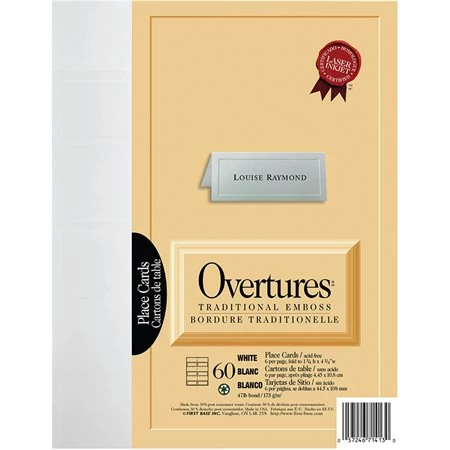Pour imprimantes à jet d’encre et laser. Bordure embossée Traditionnelle. 6 cartons par feuille, 1-3/4 x 4-1/4” pliés. Paquet de 60. Certifié FSC® C135627. Contenu recyclé : 10 %, postconsommation : 10 %. Fabriqué au Canada.