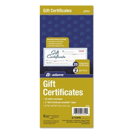 Ensemble d’unités autocopiants en 2 parties avec numérotation consécutive. Comprend : des enveloppes et un panneau indiquant « Gift Certificates Available ». Paquet de 25. Contient 2 paquets.