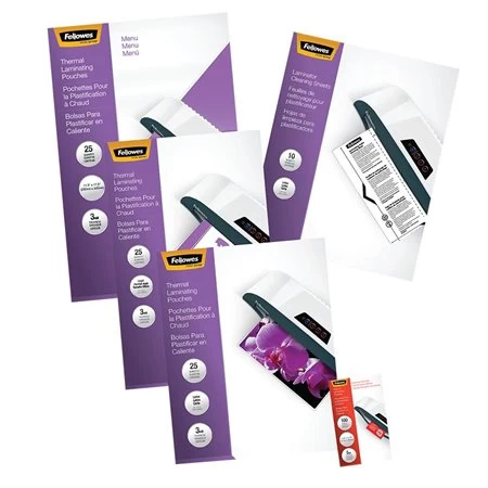 Fournitures pour 100 documents et feuilles de nettoyage. L’ensemble comprend 25 pochettes de plastification format lettre – 3 mil, 25 pochettes de plastification format lĂ©gal – 3 mil, 25 pochettes de plastification format menu – 3 mil, 25 pochettes de plastification format carte – 5 mil et 10 paquets de feuilles de nettoyage.