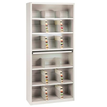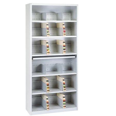 Métal. 5 tablettes réglables, 1 tablette fixe. 12 séparateurs inclus. 36 x 15 x 78 po. H. Tablette coulissante centrale en option. Fabriqué au Canada.