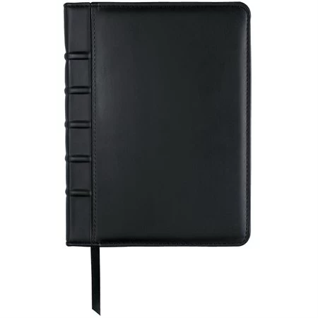 Couverture coussinée en similicuir. Signet ruban. 400 pages lignées. 9-1/2 x 7-3/8″. Noir.