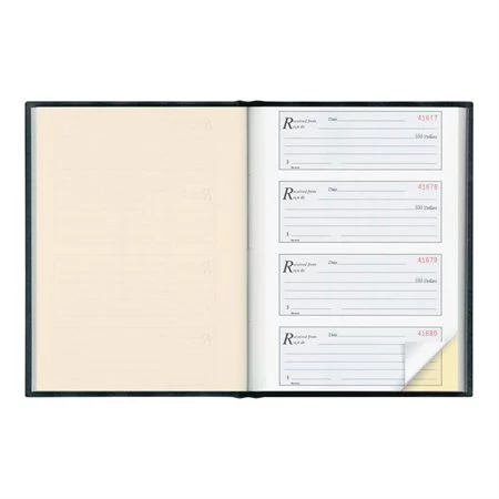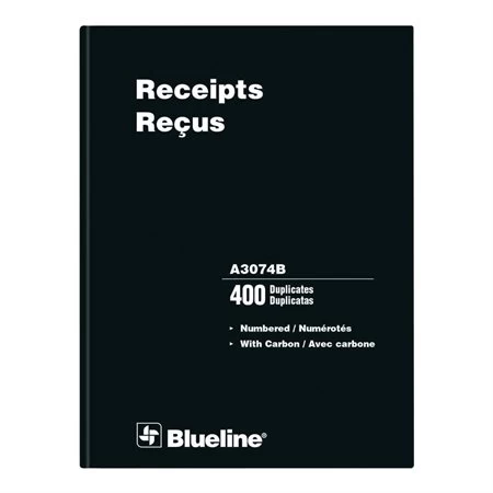 Livre à couverture rigide et reliure collée. Autocopiant. 4 reçus à la page. Bilingue. 10-3/4 x 8-1/4”.