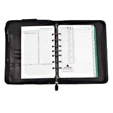 Vinyle. Fermeture à glissière. 7 anneaux. Comprend 3 mois de pages non datées. Bilingue. Noir.