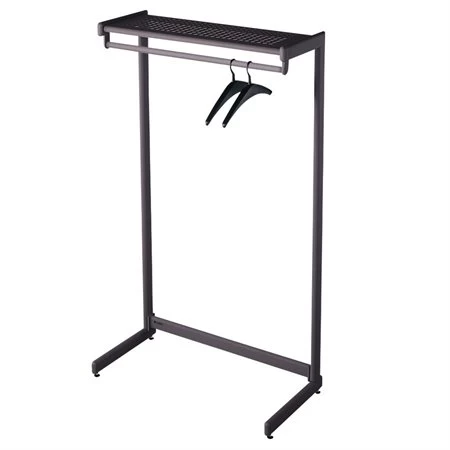 Tablette solide sur le dessus. Hauteur maximale de 61-1/2″H. Cintres non inclus. Noir.